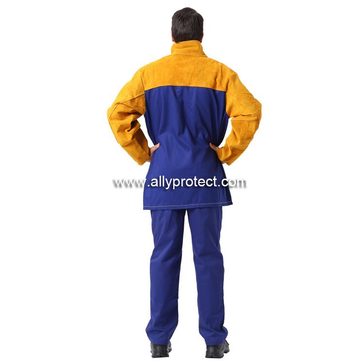 - 產品描述: [ AP ]前幅和衣袖采用金黃色牛二層皮,后幅采用藍色防護阻燃布,專為焊工在炎熱環境下工作而設計。