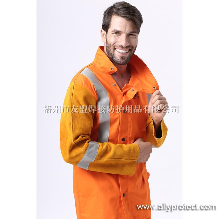 - 產(chǎn)品描述: 衣袖采用金黃色牛二層皮,衣身采用橙紅色防護(hù)阻燃布,專為焊工在炎熱環(huán)境下工作而設(shè)計。帶反光條設(shè)計,提高作業(yè)安全性。