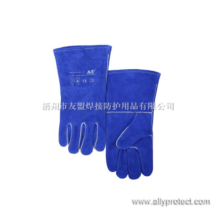 - 產(chǎn)品描述: [ AP ]彩藍色牛二層皮全皮電焊手套,斜拇指護縫設計,適用于焊接、切割及搬運等用途。